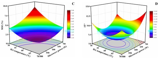 As can be seen from Figure 12D, the combination of high HA temperatures (65–70 °C) and microwave power (650–700 W) results in a significant increase in the ∆E*. This suggests that the combination of higher HA temperatures and microwave power can exacerbate the browning of kernels during drying. As shown in Figure 13D, the ∆E* is smaller at the higher MC of the transition point and lower MV thermostatic temperature. This implies that earlier access to low-temperature MVD can significantly reduce the color change of kernels. Moreover, a significant negative linear effect between the MC of the transition point and ∆E* confirms that MVD has a smaller effect on kernel color than HAD (Table 5). This is likely due to the lack of oxygen preventing enzymatic oxidation when the MV is applied [].