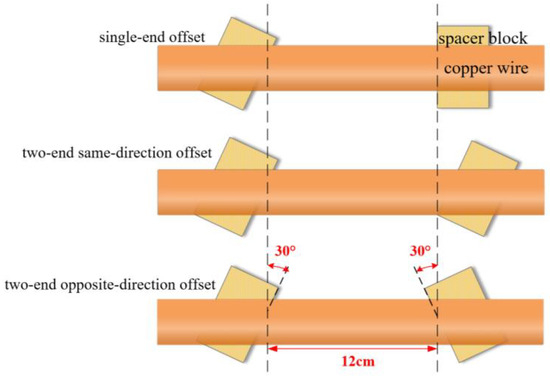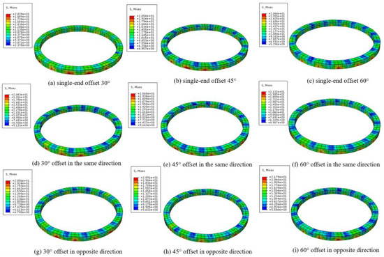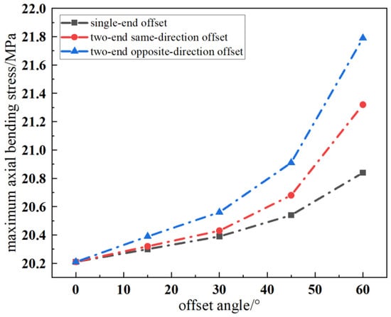 - Under the same offset angle, the winding’s bending elastic modulus is lowest for the cushion block opposite-direction offset structure, indicating the poorest mechanical performance. The cushion block’s same-direction offset structure follows. For the axial bending stress in an opposite-direction offset structure, when the offset angle is 30°, 45°, and 60°, the maximum axial bending stress increases by 1.73%, 3.46%, and 7.82%, respectively, and the degree of reduction in the axial winding strength progressively intensifies.