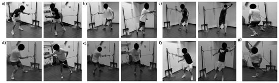Resistance training with flywheel protocol. (a) Low forehand movement; (b) middle forehand movement; (c) high forehand movement; (d) low backhand movement; (e) middle backhand movement; (f) high backhand movement; (g) one-handed shoulder press.