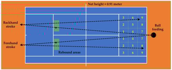 Shot precision test (SP): Forehand and backhand shot precision was evaluated according to Wiebe [34]. The participant was positioned behind the baseline and hit the ball sent by a tennis feeding ball (Spinfire Pro 2; Spinfire Sport, Melbourne, VIC, Australia). The tennis feeding ball was positioned centrally, one meter away from the baseline of the field, and ejected in a predefined direction with a velocity of 20 m/s. The field was divided into graded zones with a score from 0 to 9. The athlete had to perform 10 forehand and 10 backhand attempts, hitting a specific target in the opposite field in order to achieve the highest score, depending on the area where the ball landed. If the ball did not hit the target or the athlete failed the shot, a score of 0 points was assigned. The test score was obtained by the sum of the points achieved after 10 forehand and backhand attempts. To count points, we recorded each trial using GoPro HERO4 Black cameras set at 240 Hz, 1280 × 720 pixels (GoPro Inc.; San Mateo, CA, USA) placed behind the tennis ball machine at a height of 10 m. The SP test is shown in Figure 2.