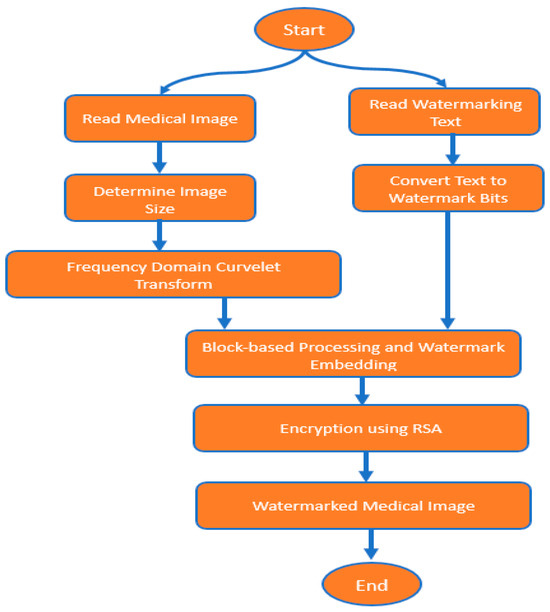 Initiating with medical images and the watermarking text, the algorithm systematically navigates through a series of strategic stages. These include reading the medical image and determining image dimensions, which are essential for watermark embedding. Leveraging specialized encoding schemes, textual information is converted into bits to serve as watermarks. The Algorithm 1, SecureMediMark algorithm then applies an advanced Frequency Domain Curvelet Transform (FDCuT), effectively dissecting the image into distinct frequency sub-bands crucial for subsequent watermark embedding and security measures. The process continues with block-based transformations, a Discrete Cosine Transform (DCT), and strategically embedding text watermark bits within transformed coefficients. Conclusively, encryption using the robust RSA algorithm fortifies the watermarked coefficients, ensuring the security and confidentiality of embedded information within the medical image. This amalgamation of diverse processes in the algorithm is designed to strengthen medical images against unauthorized access, ensuring the protection and privacy of the embedded information.