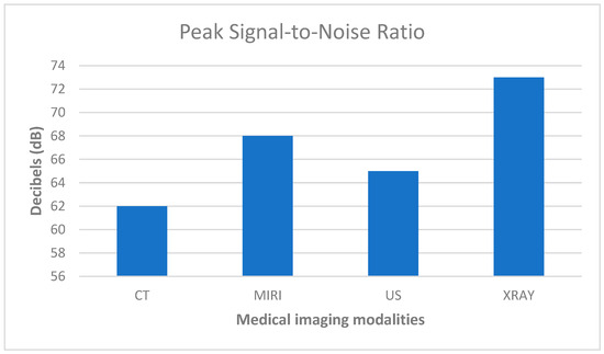 According to Figure 5, the X-ray modality has the highest PSNR value of 73 dB. This indicates that X-ray images have the highest quality among the listed modalities in terms of the signal-to-noise ratio. The higher PSNR value suggests that the X-ray images have less noise and better fidelity in preserving the signal details than the other modalities listed.
