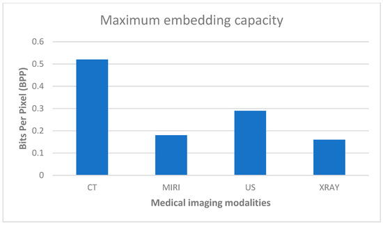 Figure 6 shows that the CT modality exhibits the highest maximum embedding capacity of 0.52, indicating a more significant potential for concealing additional data within the images produced using CT scans without substantially compromising the original image quality or being easily detectable by observers or analysis tools. This suggests that CT images have a comparatively larger capacity for steganographic data hiding than the other modalities listed.
