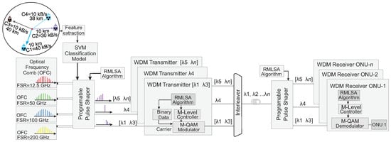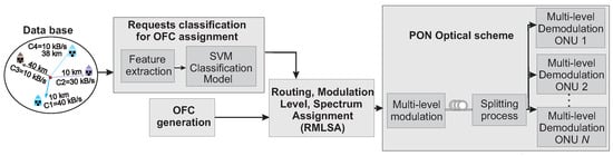 The methodology proposes a three-stage methodology for the selection of the appropriate type of OFC to transmit information in a PON network. The first stage involves developing a machine learning algorithm to select the appropriate OFC based on the network’s characteristics. In the second stage, a reliable path and a deterministic generation strategy for the OFC are defined. Finally, an RMLSA algorithm is implemented to efficiently allocate the generated spectrum using a programmable line-by-line pulse shaper. This work validates the algorithm in various request scenarios and compares its performance to that of other approaches in the literature. Figure 1 shows the proposed methodology’s diagram.