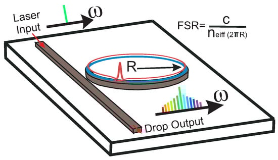 An MRR is a compact, integrated optical device typically fabricated on a silicon substrate. It consists of a ring-like or disk-like waveguide structure that allows light to circulate within it. This circular or looped design enables optical resonance, where specific optical frequencies or wavelengths, become trapped and accumulate within the microresonator (see Figure 2). As light is input into the microresonator through an optical waveguide, it circulates within the closed-loop structure, and, due to the constructive interference of the trapped wavelengths, it intensifies over multiple round trips. This phenomenon generates an optical frequency comb.