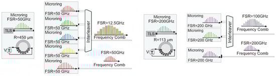 We propose two structures based on the approach described in [35] to achieve the desired separation between grid lines. The first structure employs four MRRs with a free spectral range (FSR) of 50 GHz, and their temperature is controlled to shift them by 0 GHz, 12.5 GHz, 25 GHz, and 37.5 GHz. The combination of the wavelengths generated by each MRR using an interleaver results in a final optical comb with a line spacing of 12.5 GHz and four times the number of wavelengths generated by a single MRR. The second structure uses two MRRs with an FSR of 200 GHz, and it utilizes the methodology proposed in [35] to achieve a final line spacing of 100 GHz. The designers should note that the fundamental structures of this design are MRRs with an FSR of 50 GHz and 200 GHz, and they can also use them separately to obtain these FSRs. The scheme for the generation of these combs for the previously proposed line spacings can be observed in Figure 3.