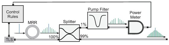 Obtaining DKS in optical microresonators is a complex process requiring a control strategy to achieve a single soliton state. Therefore, we propose the scheme illustrated in Figure 5 to overcome this challenge. In this proposal, we generate an OFC and subsequently employ a splitter to obtain the minimum fraction of the optical wave (1%) to verify the attainment of the DKS state. To validate the DKS state, we filter the signal with a reject band at the central frequency (1.55 µm) and measure the power using an optical detector. If the power falls within a specific range, we conclude that we have generated the soliton; otherwise, we must repeat the generation process until we achieve the desired state. As we base our methodology on simulations rather than physical experiments, we use the intracavity power as an analog measure of the power measured by the optical detector. The power spectral density measures the energy accumulated within the MRR, indicating the presence of the DKS. With this strategy, we can validate the methodology without losing generality in the proposal. In our simulations, the ranges of intracavity power for the verification of the generation of the DKS are and a.u., for 50 GHz and 200 GHz MRR, respectively. This ranges should be adjusted experimentally by taking into account all the optical losses from the MRR to the detector and analyzing the soliton steps.