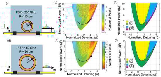 In this section, we present the results obtained from validating the performance of the proposed method in this research. Figure 6 illustrates the characterization of the parameter space for rings with an FSR of 200 GHz and 50 GHz. Note that the lower-right portion (SCS) shows the region with optical combs that exhibit a larger number of spectral lines (DKS), and we identify it in magenta. We propose a non-linear path design in [42] to avoid the chaotic region and enable reliable comb generation due to the difficulty of generating this comb type. Figure 8a,e show the proposed paths in black. It is important to note that the MRR in Figure 8a facilitates DKS generation by possessing a zone with higher amplitude. In contrast, the MRR in Figure 8d demonstrates the less frequent appearance of these states, indicating that their generation poses a difficulty for this geometry.