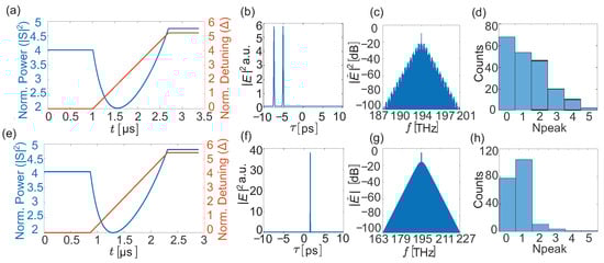 (a) Pump power (blue) and detuning (red) vs. slow time (t) using 450 µm. (b) Optical intensity using 450 µm. (c) Optical spectrum using 450 µm. (d) Histogram of the number of peaks (Npeak) for 200 simulations using 450 µm. (e) Pump power (blue) and detuning (red) vs. slow time (t) using 113 µm. (f) Optical intensity using 113 µm. (g) Optical spectrum using 113 µm. (h) Histogram of the number of peaks (Npeak) for 200 simulations using 113 µm.