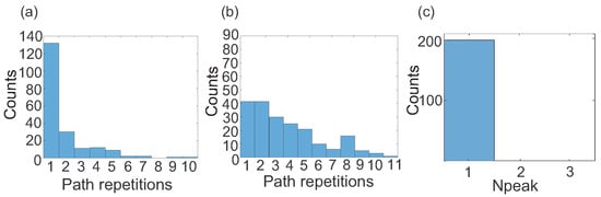 (a) Repetition histogram for the control strategy using the 113 µm MRR. (b) Repetition histogram for the control strategy using the 450 µm MRR. (c) Npeak histogram of 200 simulations for 113 µm and 450 µm MRR.