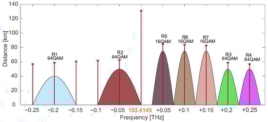 For the validation phase of the allocation algorithm, we propose a scenario that includes eleven wavelengths of an OFC with an FSR of 50 GHz and seven requests. This experiment aims to improve our understanding of the allocation process and algorithm functioning. In order to assign lines, we propose using a multi-level quadrature amplitude modulation (QAM) format, which allows for modulation levels of 16, 32, and 64, thereby ensuring the attainment of varying bandwidth levels within the limitations of distance. The first user (R1) requests 450 Gbit/s at 40 km; the second user (R2) requests 200 Gbit/s at 50 km; the third user (R3) requests 100 Gbit/s at 50 km; and the fourth (R4), fifth (R5), sixth (R6), and seventh (R7) users request 50 Gbit/s at distances of 50 km and 75 km. Figure 11 shows the OFC wavelengths, their kilometer capacities, and the results of spectrum assignment for the requests. Note that our method assigns each request in a modulation format that guarantees the minimum transmission distance. Furthermore, note that requests 1 and 2 use super-channels to support modulation. This result verifies that the algorithm responds to the ideas proposed for the assignment.