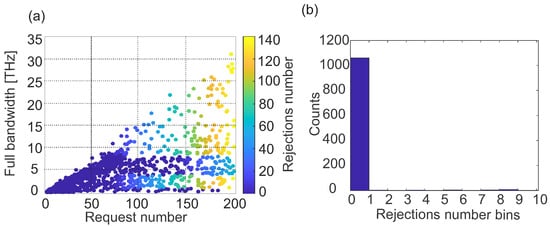 Subsequently, we propose an experiment with 1400 request scenarios based on the variations in Table 1. The goal of this experiment is to compute the performance of the proposed method. To carry out the assignment, we employ an SVM to select the appropriate OFC and apply the proposed RMLSA algorithm. These request scenarios can simultaneously accommodate up to 200 requests, with a maximum bandwidth of 31 THz. Figure 12 displays the number of rejections obtained by the assignment algorithm. Notably, increasing the number of requests and their respective bandwidths leads to a corresponding increase in rejections (see Figure 12a). This observation emphasizes the importance of maintaining the maximum number of available carriers to prevent these rejections. Furthermore, rejected requests are more likely to have large bandwidths because a request of such magnitude requires a super-channel, significantly reducing the number of available carriers. Despite encountering rejections during the exercise, it is important to note that the rejection number is minimal. Specifically, out of the 1400 request scenarios, 1060 could be addressed using the proposed method (see Figure 12b). These findings imply that the proposed method is reliable when facing real-world network situations. It is important to emphasize that the allocation of users relies on three factors: the request bandwidth, the quantity of carriers accessible for assignment, and the transmission distance of each user. Bandwidth demands may necessitate a substantial quantity of carriers to construct a super-channel, consequently diminishing the pool of carriers available for other users. Moreover, not all carriers can meet quality of service (QoS) requirements due to the sech2 profile of the frequency comb. Consequently, when customers are situated at significantly extended distances, the likelihood of their requests encountering rejection elevates. Hence, maximizing the amount of available spectral components is imperative to enhance the network allocation performance.