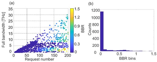 Another important metric to measure network efficiency is BBR; this metric quantifies the likelihood of the network being blocked due to a bandwidth that exceeds the assignable limit. Figure 13a shows the BBR calculation for each network request. As with the previous figures, there is a higher probability of blocking when requests with many customers and large bandwidths exist. However, Figure 13b shows that our method successfully addresses 1090 requests with a blocking probability of zero, accounting for 81% of the total requests. This result demonstrates that our method exhibits adequate adaptability to this type of demand.