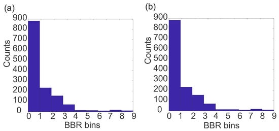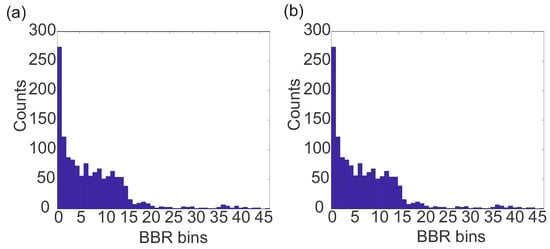 (a) BBR histogram using eight lasers and FF method. (b) BBR histogram using eight lasers and RWA algorithm and eight lasers.