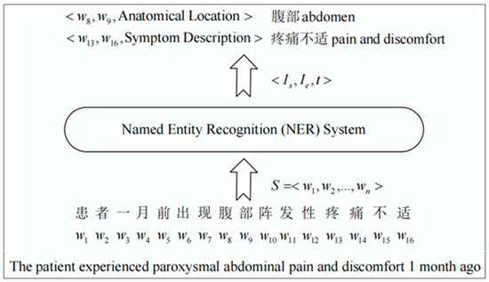 NER constitutes the initial critical stage in the realm of natural language processing for information extraction [2]. Compared to general-domain texts, electronic medical record texts contain more domain-specific terminologies. For the electronic medical record NER task, the entity categories to be identified include anatomical location, disease diagnosis, symptom description, etc. Our purpose is to recognize these types of entities from clinical sentences. The formalization process of NER can be defined as follows: given an annotated sequence , we can obtain a list of triples after the recognition, where each triple contains the information of an entity [3]. For example, in the triple , and respectively refer to the start index and the end index of an entity, and is one of the predefined entity types. Figure 1 shows an example of the NER process. The input is a Chinese electronic medical record, “患者一月前出现腹部阵发性疼痛不适 The patient experienced paroxysmal abdominal pain and discomfort 1 month ago”, and two triples have been obtained after the NER system. The resulting triples indicate that “腹部 abdomen” is the entity of anatomical location, and “疼痛不适 pain and discomfort” is the entity of symptom description. In the NER system, people frequently overlook the fact that every component of the model is purposefully driven to generate the desired results. The automatic identification of these entities in electronic medical records plays a pivotal role in the development of medical informatics.