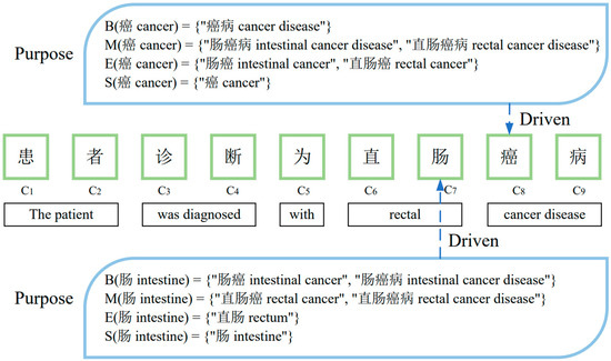 Individuals may perceive the same thing differently, and varying purposes can yield distinct outcomes. Similarly, as for the character , we use the word frequency dictionary constructed in the data pre-processing stage to obtain the relevant words, and thus, construct four sets, , , , and , where is the set including all words starting with ; is the set including all words with as the middle part; is the set including all words ending with , and is the set of a single character . These four sets signify four distinct purposes and encompass semantic details pertaining to various facets of entities. As shown in Figure 3, in the sequence of “患者诊断为直肠癌病 The patient was diagnosed with rectal cancer disease”, these four sets corresponding to the character “肠 intestine” are as follows: = {“肠癌 intestinal cancer”, “肠癌病 intestinal cancer disease”}; = {“直肠癌 rectal cancer”, “直肠癌病 rectal cancer disease”}; = {“直肠 rectum”}; and = {“肠 intestine”}. It is obvious that the same lexical set may contain more than one word, such as , which indicates that there are two words beginning with “肠 intestine”. To achieve a more harmonious balance among these four purposes and facilitate their fusion, it is essential to assign weights to them based on word frequency.