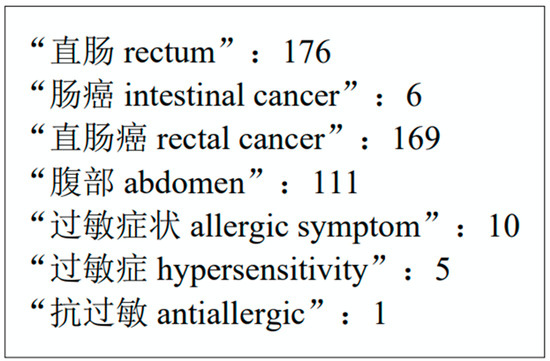 Since the word frequency dictionary needs to be constructed in the representation layer of SLRBC, we extract words from the datasets and count the frequency of each word. In this regard, the CCKS2018 word frequency dictionary encompasses 7619 words, while the CCKS2019 word frequency dictionary comprises 10,566 words. Exemplary words and their respective frequencies from the word frequency dictionary are depicted in Figure 5.