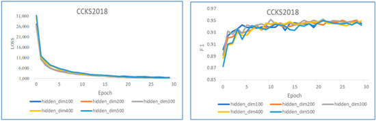 LOSS and F1 under different hidden layer dimensions on CCKS2018.