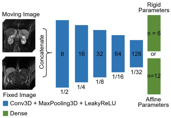 We used a modified variant of the affine network proposed by [15], since it achieved the best registration results in our datasets as demonstrated previously [37]. The network architecture was modified to allow for a rigid transformation in addition to the original affine transformation. The rigid and affine subnetwork is composed of five convolutional blocks (Figure 1). Each contains a three-dimensional convolutional layer with a kernel size of 3 × 3 × 3, a stride of 1 and padding same, a maxpooling layer with a factor of 2 and a LeakyReLU activation layer. A dense layer is then used to calculate the 6 or 12 parameters required for a three-dimensional rigid or affine transformation.
