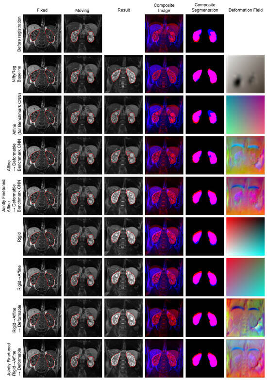 Examples of registration results can be seen in Figure 3. Before registration, the abdomen in the T1-weighted (fixed) and T2-weighted (moving) MR images is not well aligned. Registration with the baseline NiftyReg (second row in Figure 3) improved the structural similarity and the overlap of kidney segmentations. The rigid subnetwork (row six in Figure 3) significantly improved the spatial alignment compared to before registration. When adding the affine subnetwork, the overlap of the kidney segmentations is further improved compared to the rigid subnetwork (row six and seven in Figure 3). However, other structures, such as the liver, do not overlap well in the fixed and moved image, as is visible in the composite image. By adding the deformable subnetwork (row eight in Figure 3), the structural similarity of all structures is improved, especially visible in the liver in the composite image. Jointly finetuning the multistage network further increased the overlap of all structures (clearly visible in the liver). Comparing the registration result of the jointly finetuned multistage network (row nine) with the jointly finetuned benchmark (row five) demonstrates improved spatial alignment of all corresponding structures, especially visible in the liver, using the proposed multistage network. The deformations within the organs are smooth (sixth column in Figure 3). The largest deformations are located at the organ boundaries, especially at the liver and spleen.