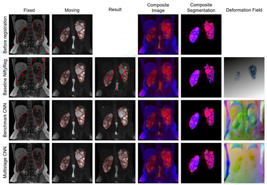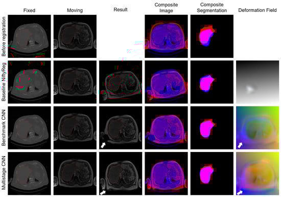 Example registration results are presented in Figure 7. A large rigid part of the deformation is visible in the images before registration, as the fixed image is shifted downwards compared to the moving image. Registration with the baseline improved the overlap of the liver segmentations; however, the moved image is rotated incorrectly. Here, the rigid or affine algorithm of the baseline computed an incorrect transformation. Registration with the benchmark improved the spatial alignment and overlap of the liver segmentations. However, in the moved image, the torso on the right side and parts of the right arm were deformed in a medically implausible way. This area is marked by a white arrow. The registration with the proposed multistage network also produced a medically implausible deformation on the right side of the torso (white arrow in result image in the fourth row). Apart from this area, the overlap of the corresponding structures improved following the registration. The area of the medical implausible deformation is also visible in the deformation field (white arrow in column six in Figure 7).