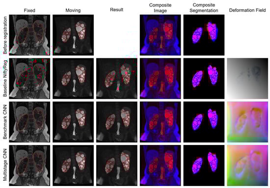 Examples of registration results can be seen in Figure 5. The fixed and moving image already show a reasonably good spatial alignment before registration; only fine structures in the kidney need to be corrected. The registration with the Baseline NiftyReg further improved the overlap of the kidneys. The benchmark and the proposed multistage network yielded similar results as before the registration. The deformation field of the multistage network shows smooth deformations.