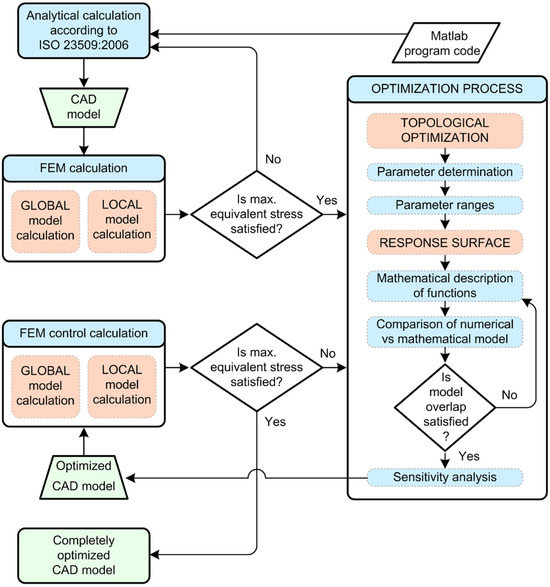 The algorithm connects the design of the ODT according to ISO 23509:2006, numerical calculation of design elements (ring gear and drive shaft with pinion) using the FEM numerical static analysis and numerical FEM static structural global–local model analysis of pinion and ring gear, TOM and obtained results of the FEM analysis in the finding of the global design parameters. Also, the proposed algorithm uses the application of RSM in the creation of a mathematical model (objective function of overall mass reduction and two partial mass reduction functions). A comparison between the predictions of the mass reduction functions of the mathematical model and the numerical model was generated. Using the global–local static structural numerical FEM approach, a control numerical calculation of the optimized design elements was performed, in order to control the accuracy and the reliability of the obtained mathematical model.