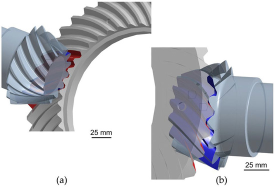 According to the calculated values of the geometric quantities from Table 3 and Table 4, pinion and ring gear were constructed (Figure 4).