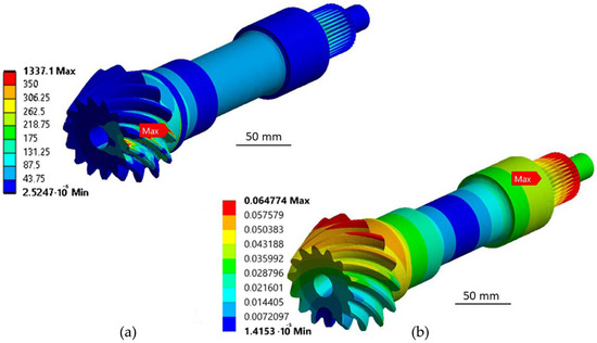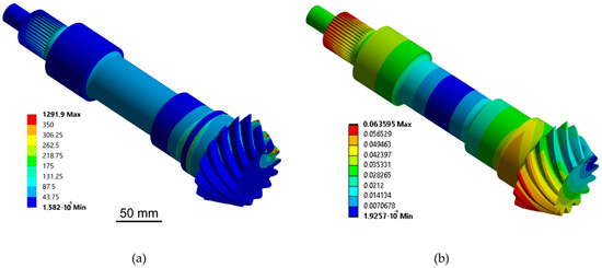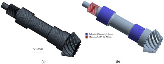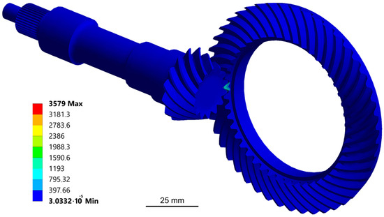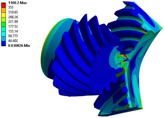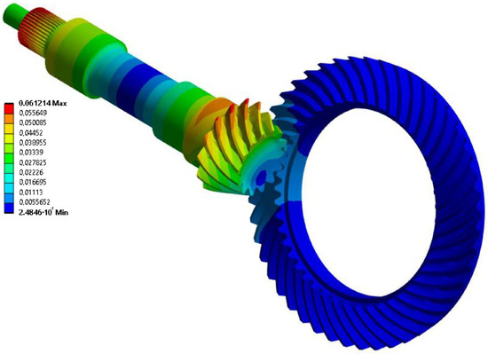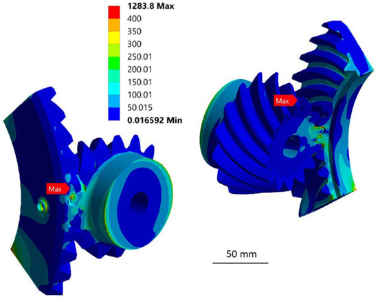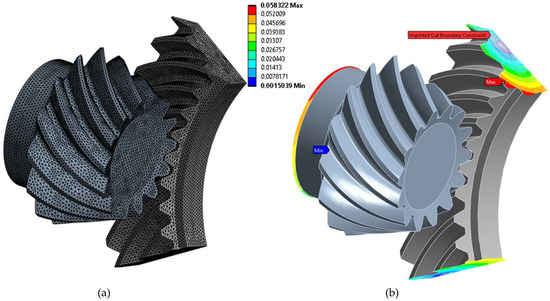 Stress calculation in the tooth root was carried out for the most unfavorable case of tooth loading, i.e., when the force acts on the tooth crown. Loadability of the flanks represents the limit up to which the flanks of the teeth can be loaded without causing damage to the flanks of the teeth known as pitting [39,40]. The material of the pinion gear is 17CrNi6 and the selected material for ring gear is 15CrNi6. For these materials, the amount of permanent dynamic strength for tooth root is σFlim1 = σFlim2 = 500 MPa and amount of permanent dynamic strength for tooth face flank is σHlim1 = σHlim2 = 1630 MPa.