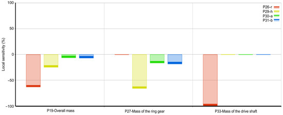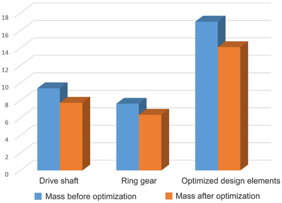 Through regression analysis of the previously obtained four design parameters, a mathematical model was obtained that describes the influence of each design parameter on partial masses and overall mass of differential transmission. In this paper, the mathematical objective function of the overall mass reduction of the ODT-optimized design elements was obtained. Two partial mathematical mass reduction functions were also obtained and presented: the ring gear mass reduction function and the drive shaft mass reduction function. The results were compared between the predictions of the mass reduction functions of the mathematical model and the numerical model. A control numerical calculation of the optimized design elements was also made, using the global–local FEM static analysis approach, in order to additionally control the accuracy of the obtained mathematical model and also the reliability of the optimized design elements.