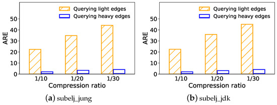 Typical graph sketches use a random hash function to map each edge to a bucket of a matrix, and then record the edge weight within the bucket, as illustrated in Figure 1. As a result of the random nature of the hash function, hash collisions may occur when querying an edge or a node with the graph sketch. There will be a significant performance degradation on query tasks if a heavy edge (an edge with a large weight) collides with a light edge (an edge with a small weight). In the example presented in Figure 1, the graph stream contains one heavy edge (edge ) with a weight of 100 and three light edges (edges , and ). It is possible for a graph sketch to map a heavy edge and a light edge to the same bucket of the matrix due to a hash collision. In graph sketch, the bucket stores the sum of the edge weights (see Section 3 for details); therefore, the value recorded in this bucket is . As a result, if we query the weight of edge , the graph sketch will return the value 101, and the relative error (see Section 5.2.1 for details) of this query is , which is extraordinary high for a light edge. We further test the performance of TCM [1], a state-of-the-art graph sketch, on two real-world datasets, subelj_jung (http://konect.cc/networks/subelj_jung-j/, access date: 10 December 2023) and subelj_jdk (http://konect.cc/networks/subelj_jdk/, access date: 10 December 2023), and the results are shown in Figure 2. It is demonstrated that TCM performs poorly on edge query tasks, and the average relative error when querying light edges is extremely high. The average relative error dramatically increases with the increase in compression ratio (i.e., reducing the size of the graph sketch). Thus, a hash collision between a heavy edge and a light edge will result in an unacceptably high query error for the light edge, which is a major limitation of conventional graph sketches.