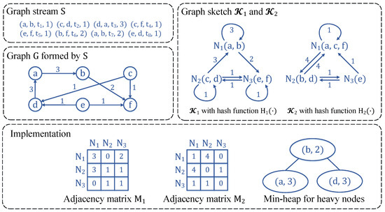 (Graph sketch [1]). Supposing that a graph is formed by a given graph stream S, graph sketch is defined as a graph whose size is smaller than G, i.e., and , where a hash function is associated with map each node in V to a node in . Correspondingly, an edge in E will be mapped to the edge in .