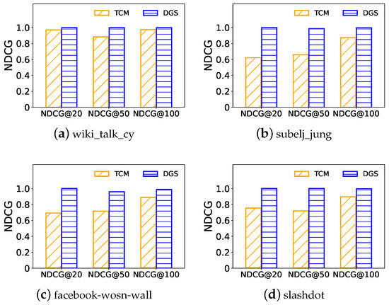 We also calculate the NDCG based on the result list of top-k heavy node query. The results are shown in Figure 7. Similarly, the NDCG achieved by DGS is much higher than that of TCM.