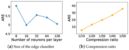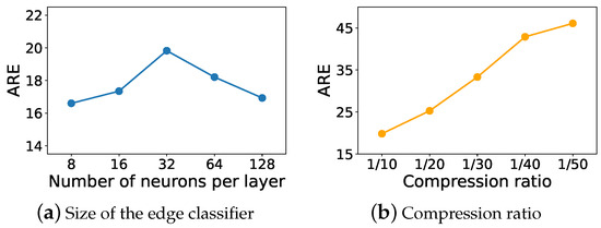 Figure 8b and Figure 9b show the change of ARE when tuning the compression ratio from to . The results show that the ARE is very sensitive to compression ratio. With the increase in compression ratio, the ARE increases drastically. Thus, to avoid an unacceptable ARE, we should use a relatively low compression ratio.