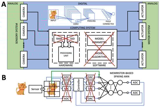 The main features of the neuromorphic analog machine vision systems, combining “in-memory computing”, “in-sensor-computing”, and neuromorphic architectures. (A) In comparison with the existing digital computer vision systems, “in-memory computing” makes it possible to process visual information entirely within the hardware when the ANN models work completely in analog form using computers based on memristive devices. (B) In comparison with the existing general memristor-based computers, in the neuromorphic analog machine vision systems, there are no analog-to-digital and digital-to-analog conversions in the process of capturing visual information via photosensors. For these purposes, the devices for “in-sensor computation” can be used in the sensory part of a system for capturing visual information in analog form, which is then fed to an ANN based on memristors.