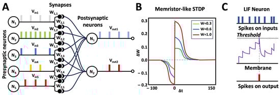 Spiking ANNs based on memristive devices. (A) Common architecture includes presynaptic neurons and postsynaptic neurons, connected by artificial synapses implemented with memristors. Presynaptic neurons generate spikes encoding input information. Spikes go through the memristive synapses and locally change their resistances in accordance with the STDP (spike timing-dependent plasticity) rule, providing the self-learning of the whole ANN. (B) The dependence of the change ΔW in synaptic conductance on the interval Δt between a presynaptic spike and a postsynaptic spike for different current synaptic conductance values W. (C) A spiking neuron receives sequences of spikes on its inputs and, under certain conditions, generates a spike at its output; for example, in the LIF (leaky integrate-and-fire) model, each spike contributes to the neuron’s status—its amplitude, which decays over time; if a sufficient number of spikes contributes to the status in a certain time window, the neuron’s amplitude exceeds a threshold, and the neuron generates an output spike [2].