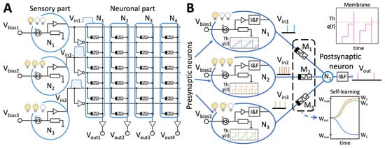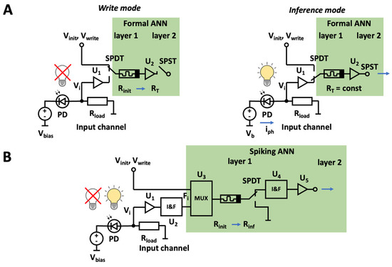 The proposed system’s architecture includes two main parts—sensory and neural. The sensory part is designed to capture and encode visual information. The signals from the sensory part, after being captured, are transmitted to the neural part for processing. The electrical circuit of the sensory part is presented in Figure 3 for two versions of ANNs—formal (Figure 3A) and spiking (Figure 3B).