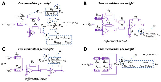 With this approach, only unipolar weights can be implemented, since the resistance cannot be negative. For bipolar weights, it is necessary to use circuits with two or, for example, four [75] memristors (Figure 4B–D). In the variants of circuits presented in Figure 4, the weights of the neuron synapses will already have bipolar values due to the difference in several resistances of the memristive devices. In the circuit in Figure 4B, this is achieved, in particular through the use of an additional differential amplifier, the output of which is the difference in voltage obtained by converting the current in each branch containing the memristor. In the circuit in Figure 4C, this is achieved by duplicating the inputs, one of which is inverse. In the circuit in Figure 4D, the output voltage is differentially taken from two voltage dividers formed by four memristors. The shape of the graph of the dependence of weight on resistance for the first case is hyperbolic, and for the second, it is linear.