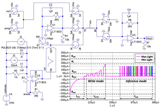 Several computer models have been developed to verify the architectures proposed here. The operation of the sensory part of a formal ANN can be demonstrated using a SPICE model (Figure 6). This model contains the following main components: an equivalent photodiode circuit, containing a photocurrent source; a memristor model [76]; an initialization and recording signal generator; and switching circuits. The signal generator allows you to supply an initialization signal to the memristor in the form of a rectangular pulse with a given amplitude and duration (init) and a recording signal in the form of a sequence of rectangular pulses with increasing amplitudes (write). For inference, a signal from the sensor is generated at the output of the U3 microcircuit in the form of rectangular pulses with a given duration.
