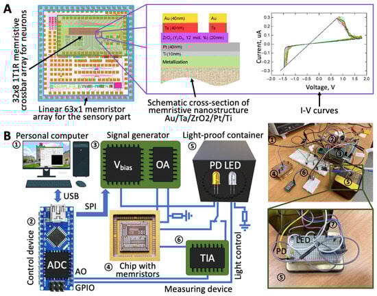 To demonstrate the operation of the proposed concept of neuromorphic analog computer vision systems, an experimental set-up was made (Figure 8). It consists of an experimental chip (Figure 8A), which includes in particular two necessary types of memristive arrays: a 63 × 1 linear memristive array for investigating the sensory part, and a 32 × 8 1T1R memristive crossbar array for investigating the neural part of the system. Memristive devices were fabricated on the basis of a Au/Ta/ZrO2(Y)/Pt/Ti multilayer structure. Each cell of the crossbar array was equipped with an N-channel MOSFET transistor (Figure 9, right side). The chip was mounted into a standard metal–ceramic package and connected with a light-proof container covering the silicon photodiodes and light sources, which can be turned on using a PC.