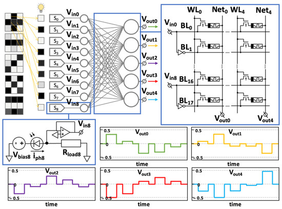 Some ways in which one can integrate the array of photosensors with the array of memristors have been proposed in [43,46]. In particular, the authors of [43] proposed a 1D1M vision sensor’s schematic layout for CMOS-compatible silicon nitride (SiNx) memristive devices and demonstrated its use for image capturing and mean filtering. The authors of [46] proposed a reconfigurable three-dimensional hetero-integrated technology for vertically stacking a diverse range of functional layers such as sensors, processors, and memory of a single-material system (for example, silicon). Such decisions could provide energy-efficient sensor computing systems for edge computing applications.