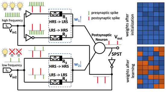 The spike ANN training process was performed as follows. At the beginning, the weights were initialized to low values by feeding initialization pulses into the ANN. Then, when visual patterns were presented to the neurons, spikes began to be generated in them depending on the illumination level of each channel. Spikes change the resistance of odd memristors towards low resistance and even ones towards high resistance, since the inputs of the ANN are duplicated in accordance with Figure 4C. This is equivalent to the fact that the weights of the synapses increase. It turns out that for channels with a high spike frequency, the rate of such change is much higher than for channels with a low frequency, since the total charge of the signal passing through the memristor in the first case is greater. When the threshold charge value on the membrane is reached, the postsynaptic neuron generates a spike, which is amplified in the feedback circuit, inverted, and supplied to all inputs. This leads to the opposite process—the resistance of odd memristors changes towards high resistance, and even ones change towards low resistance, which is equivalent to a decrease in the weight of the synapse. Since the rate of weight increase in high-frequency channels is high, a short-term decrease does not greatly affect the final value; and vice versa—in low-frequency channels, the influence of the postsynaptic spike is strong and the weight of the synapse decreases (Figure 10, right side). The inference accuracy after the ANN’s self-tuning was, as in the previous case, 100%.