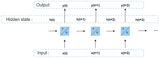 The structure of the RNN (Recurrent Neural Network) is shown in Figure 3. By comparison, it can be observed that the propagation structure of the difference wave equation has high similarity with the network structure of the RNN, and existing experiments indicate that the dynamics of the wave equation are conceptually equivalent to the RNN. Therefore, the acoustic difference equation can be embedded into the RNN structure, which enables a better understanding of the propagation characteristics of waves and maps them into the neural network structure [28].