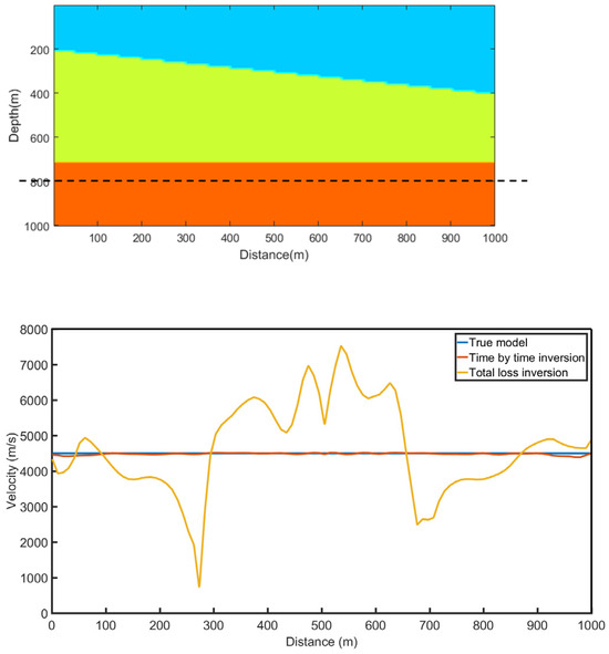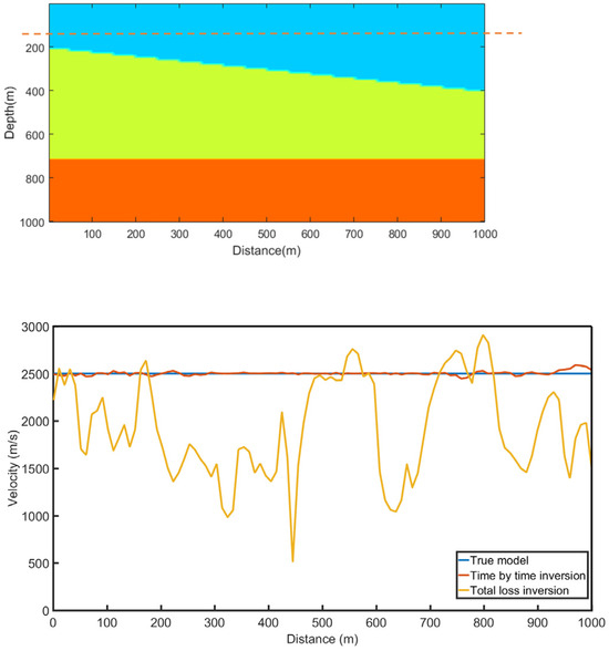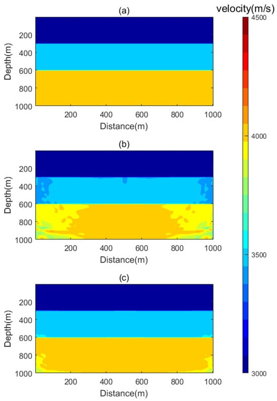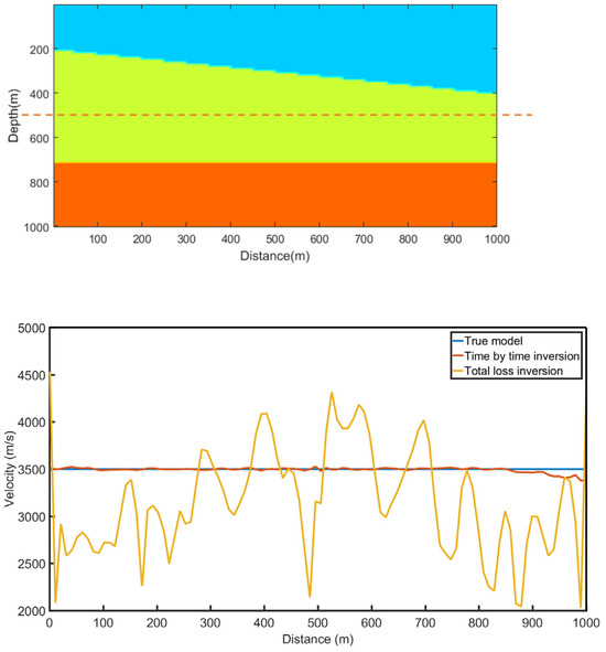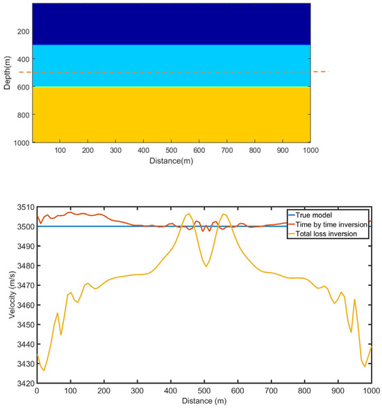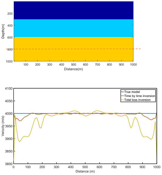 In order to validate the efficacy of the Step-by-Step Inversion Algorithm, a Homogeneous Layer Model was constructed. In this model, the velocities from the shallow to deep regions are set as [3, 3.5, 4] km/s. Synthetic datasets were computed through forward propagation using a Vertical Seismic Profile (VSP) observation system, Orthogonal parameter points are 100 × 100, with a spatial step of 10 m and a time step of 0.5 ms. The initial model has velocities set as [3, 3.4, 3.9] km/s from shallow to deep regions, simulating a scenario where the initial model is relatively accurate. The inversion was performed using the Adam optimization algorithm, with identical parameter settings for all tests. The Homogeneous Layer Model and its inversion results are depicted in Figure 7.