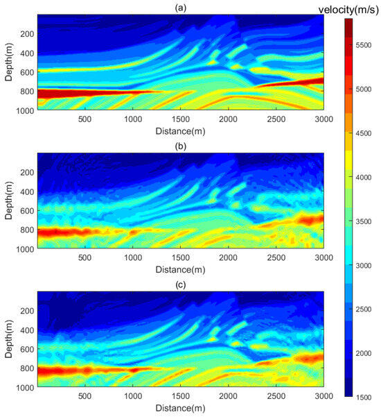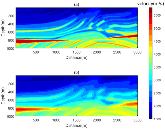 To verify the effectiveness of the algorithm under more complex real-world conditions, the experiments used a Marmousi model. The model was created through a collaboration of numerous geologists, geophysicists, and computer scientists and is capable of simulating actual complex geological conditions and is geologically consistent [29]. A relatively accurate and smooth velocity model was used as the initial model for the inversion. The real and initial models are shown in Figure 14. The VSP observation system was used to generate synthetic data from the real model with parameters of 100 × 200, a spatial step of 10 m, and a time step of 0.5 ms.