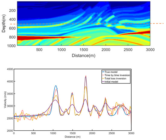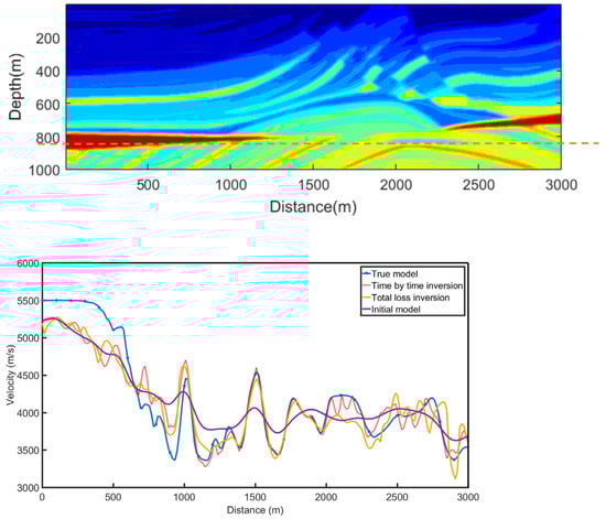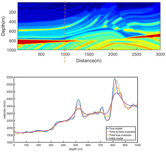 The Marmousi model and inversion results are shown in Figure 15. As can be seen from the inversion results, both the overall inversion and time-by-time inversion results are relatively close to the real model. A comparison of horizontal velocity values at depths of 500 m and 850 m is shown in Figure 16 and Figure 17, and a comparison of depth velocity values at a horizontal distance of 1000 m is shown in Figure 18. From the velocity comparison curve, it can be seen that both the time-by-time inversion and the overall inversion are relatively close to the real model. Moreover, the velocity of the time-by-time inversion results is smoother, with fewer velocity anomalies, making the inversion more stable.