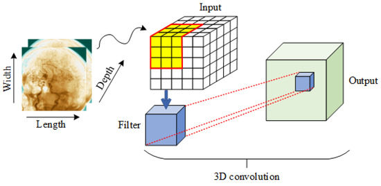 The 3DCNN neural network is capable of analyzing and recognizing various dynamic 2D objects present in both images and 3D image datasets, such as those encountered in medical imaging applications. In the 3DCNN architecture, the 3D convolution operation (see Figure 2) is applied to the dataset along three directions (x, y, z) using a three-dimensional filter. It is important to note that the values within the layer of the three-dimensional filter must be configured to be non-negative [16]. The 3D convolution operates by arranging neighboring layers around the central cube, establishing interconnected convolutional maps to capture motion information. However, it is important to note that each convolutional kernel can only capture a specific type of feature.