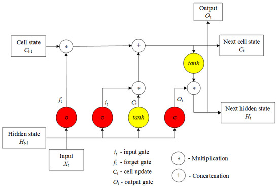 Convolutional Long Short-Term Memory (ConvLSTM) is a neural network type that merges the capabilities of both convolutional neural networks (CNNs) and Long Short-Term Memory (LSTM) models. The CNNs are conventionally applied to image processing, excelling at feature identification and extraction from images. Conversely, LSTM models find their utility in time-series analysis, employing memory cells to preserve information across time steps. ConvLSTM is specifically engineered to unify these two models, making it proficient at managing spatiotemporal data encompassing both spatial and temporal dependencies. The ConvLSTM model’s structure (see Figure 3) comprises four primary components [21]: