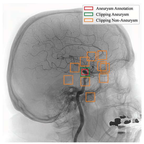 All cropped images pass by zero-mean normalization. Thus, the original 10-bit grayscale pixel was converted from an original range of 0–1023 to a unit value and shifted by the mean value to a final range from −0.5 to +0.5. Figure 6 illustrates the procedure we used to cut the data for aneurysms and non-aneurysms from the original image. The red rectangle represents the original annotation. For the purpose of training the model, it is inconvenient for us that the annotation region has different dimensionality for different images, patients, and aneurysm sizes. For training, we used a square region centered by the original annotation. It is shown by the green square. Around the annotation, we clipped non-aneurysm vasculars. If a random cut interfered with the annotated region, we ignored it and replaced it with another cut. Because there are disproportionately more healthy vessels, we limited the number of non-aneurysm clippings to 10.