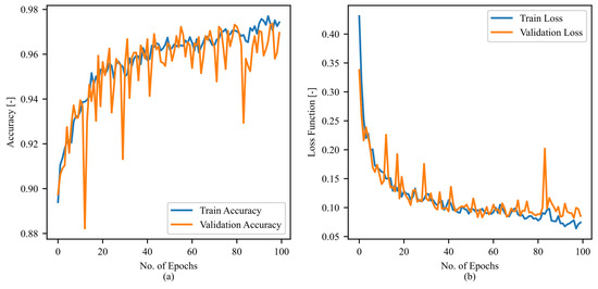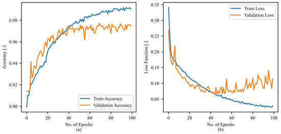 Training process of the proposed 2DCNN model. (a) The train and validation accuracy. (b) The train and validation loss function.